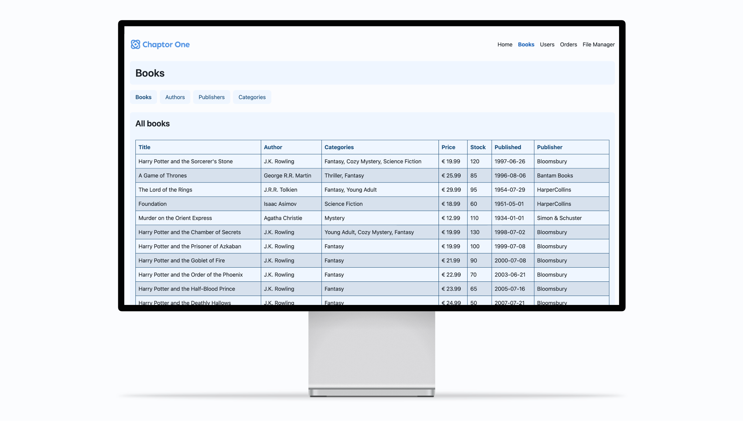 Chapter One Backoffice is a web-based backoffice application developed for a fictional bookstore named Chapter One. The system enables administrators to manage core business data, including products, orders, and customers.