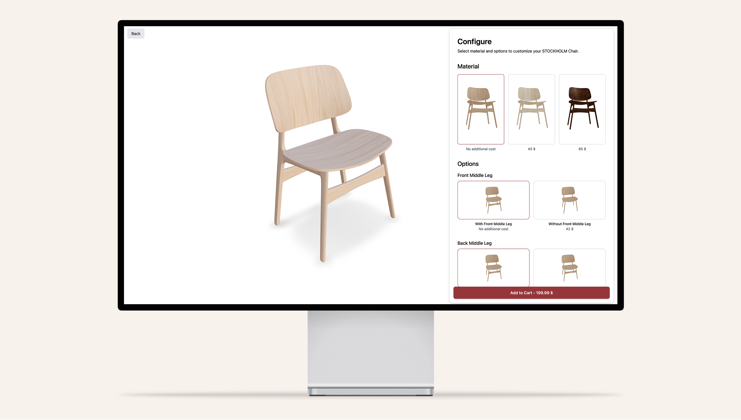 The primary product is the STOCKHOLM chair, a detailed 3D model created in Blender. Users can change materials, toggle components such as cushions, and view the chair from all angles. Every change is immediately reflected in the 3D scene, providing a clear and responsive user experience.